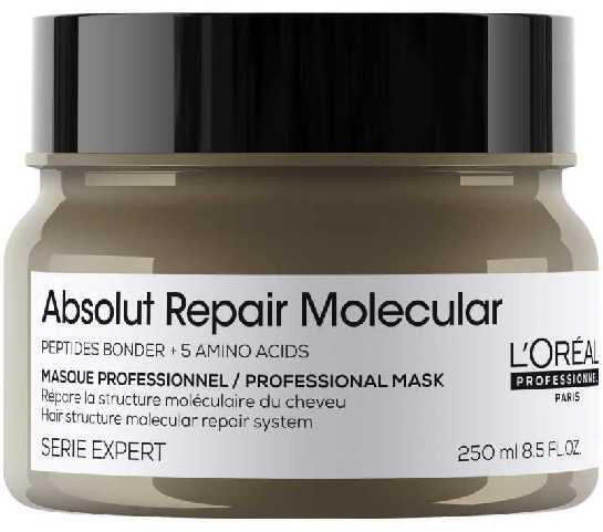 L'Oréal Professionnel Serie Expert Absolut Repair Molecular Mask este o mască pentru păr îmbogățită cu peptide și aminoacizi. Această combinație perfectă este capabilă să regenereze părul deteriorat de până la 2 ani. Pătrunde în fibra capilară, unde reface intens straturile macromoleculare. După utilizare, părul este mai puternic, hrănit și flexibil. Masca este potrivită pentru toate tipurile de păr deteriorat, indiferent de textura lor. Este, așadar, ideală atât pentru părul vopsit, cât și pentru cel decolorat sau natural.