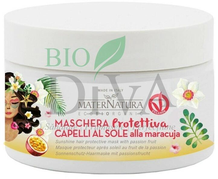 Masca de păr cu maracuja Maternatura are un efect restructurant fiind potrivită pentru părul uscat, deteriorat, casant, creț care a fost expus timp îndelungat la soare, apă de mare și clorul din piscine. Combate efectele negative ale soarelui, are un efect de descurcare, conferă elasticitate, hrănește și restructurează firul de păr. Parfumul măștii este dat de florile de tiare.