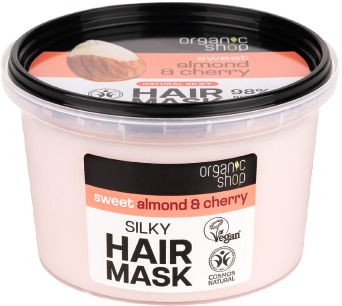 Organic Shop Sweet Almond & Cherry Silky Hair Mask este ideală pentru părul vopsit, a cărei formulă este îmbogățită cu extract de migdale și cireșe organice. Oferă părului hidratare profundă și nutriție, întărind în același timp firul de păr. După utilizare, părul devine strălucitor, sănătos și ușor de descurcat.